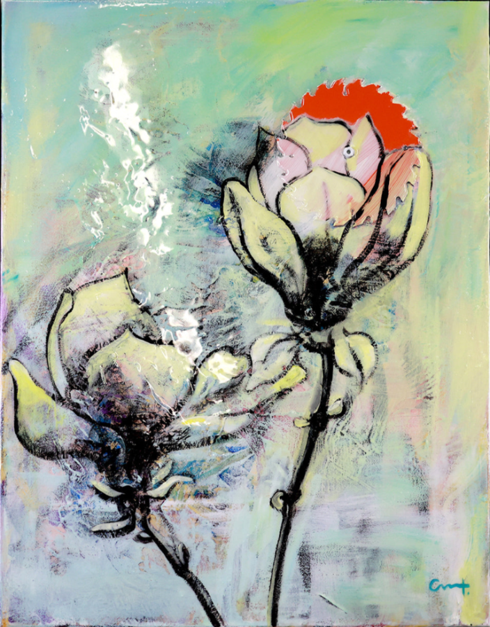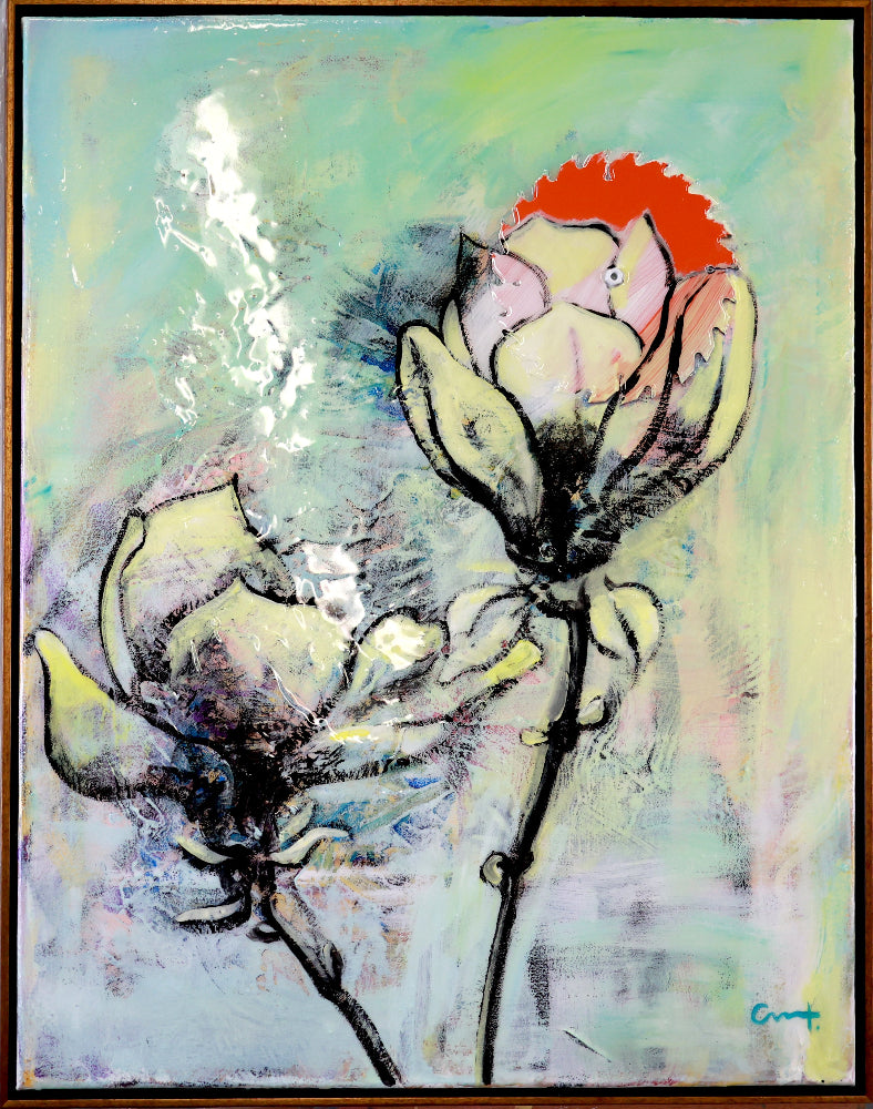 A saw blade “grows” from a magnolia bloom—soft in appearance, yet strong at heart.