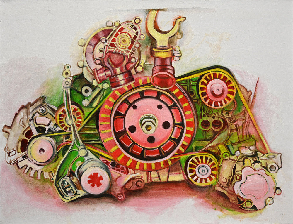 This is the first work in the series. I started with intuition, but during the painting process I felt that this was the direction I wanted. The gears felt like they were turning under my brush, and my emotions were withdrawn from the turbulent real life and slowly calmed down. The reality was suspended, and the picture continued.