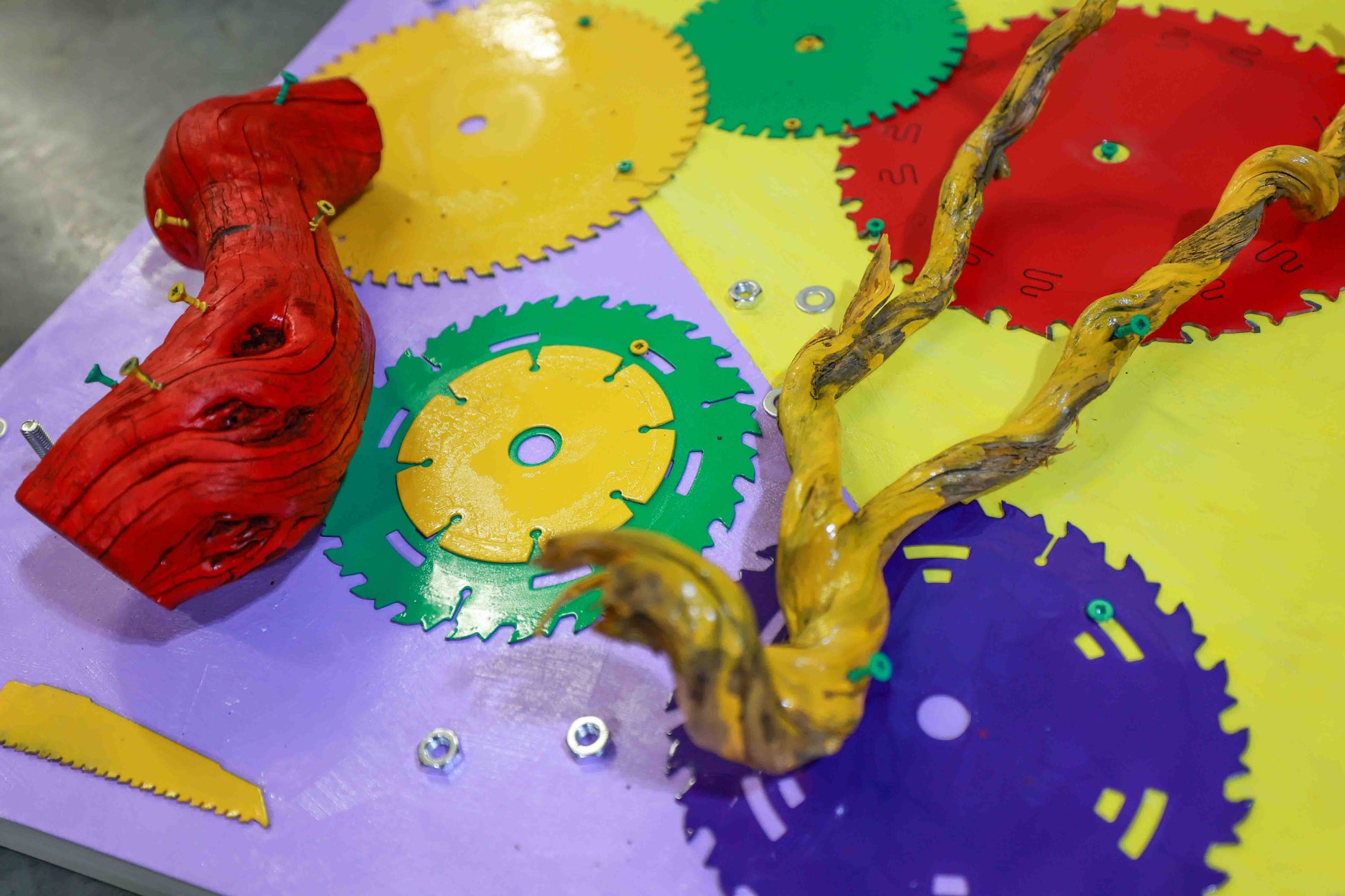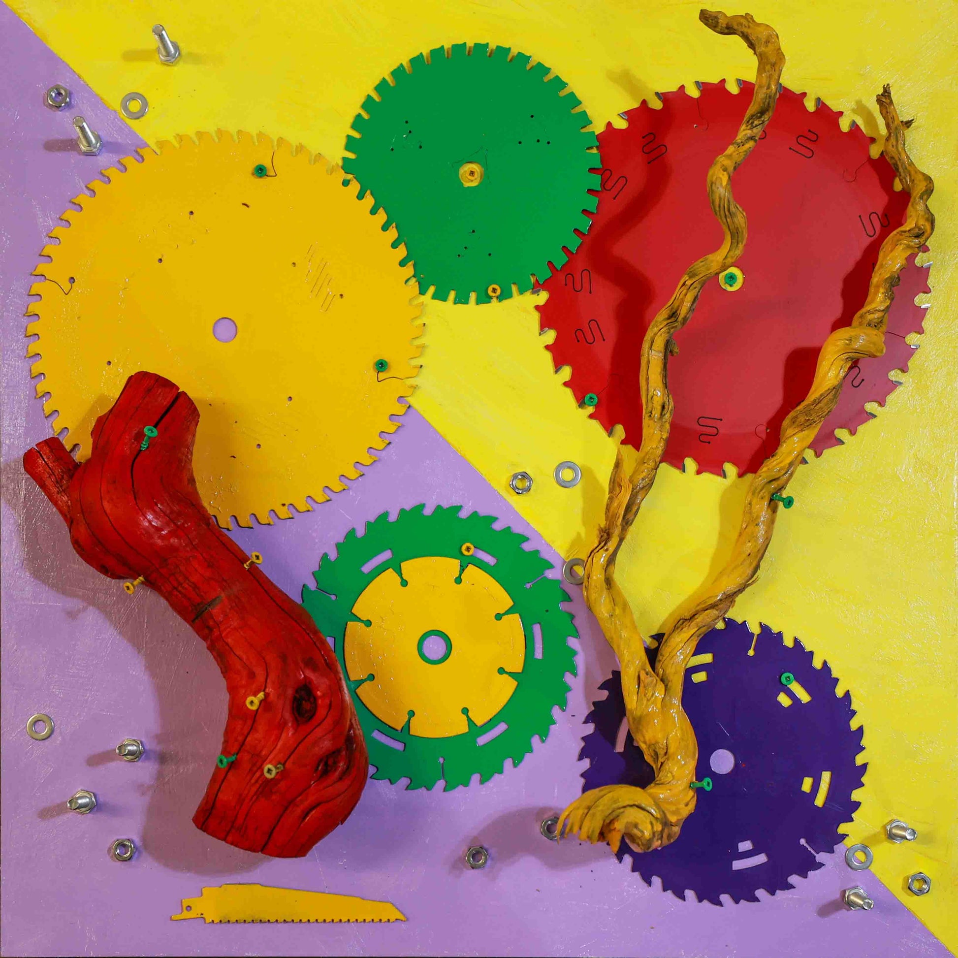 Saw blade and wood, cutting and being cut, industry and nature, rules and freedom. Put on bright clothes and live in harmony in this defined space.